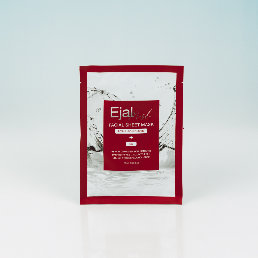 Ejal Facial Sheet Mask with hyaluronic acid & B5. The synergistic effect of hyaluronic acid and vitamin B5 can make dry skin hydrated. Deeply nourishes the skin. Repairs sensitive skin or skin with damaged stratum corneum. Leaves skin hydrated and smooth.